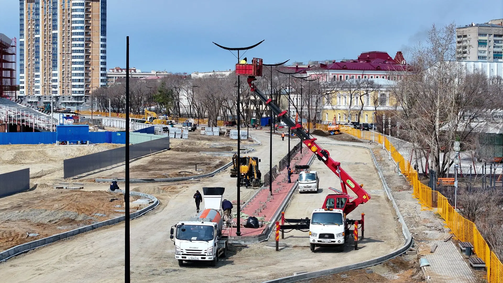 Сейчас укладывают тротуарную плитку на участке от Шимановского до Театральной, монтируют автобусный павильон на пересечении с Островского, занимаются озеленением.
