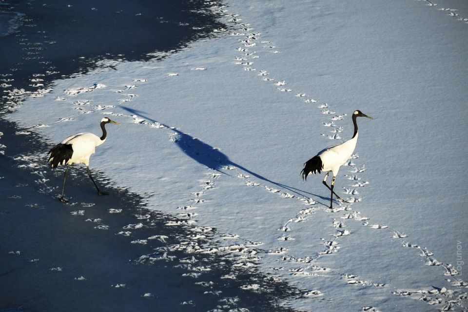 Тогда как все другие виды журавлей улетели на зимовку в теплые страны, морозостойкие Японские журавли вовсю исследуют замерзающие болота в поисках рыбы и лягушек.При этом конкуренции с другими птицами у Японских журавлей не осталось.На зимовку они...
